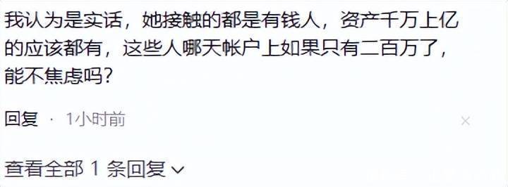 她身边来往的都是有钱人,你要是让那些千万富翁账上只剩两百万,他们肯定也觉得天要塌了,焦虑得不行。